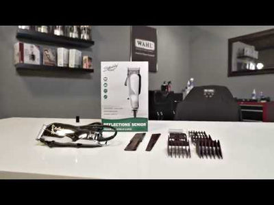 El Reflections Senior de la línea Sterling también tiene una cuchilla # 2191 Wahl Fade. Sin embargo, mejora el modelo anterior con accesorios. Recibes todo el conjunto de 8 guardias Wahl, en lugar de los 3 peines que obtienes con los otros dos modelos.